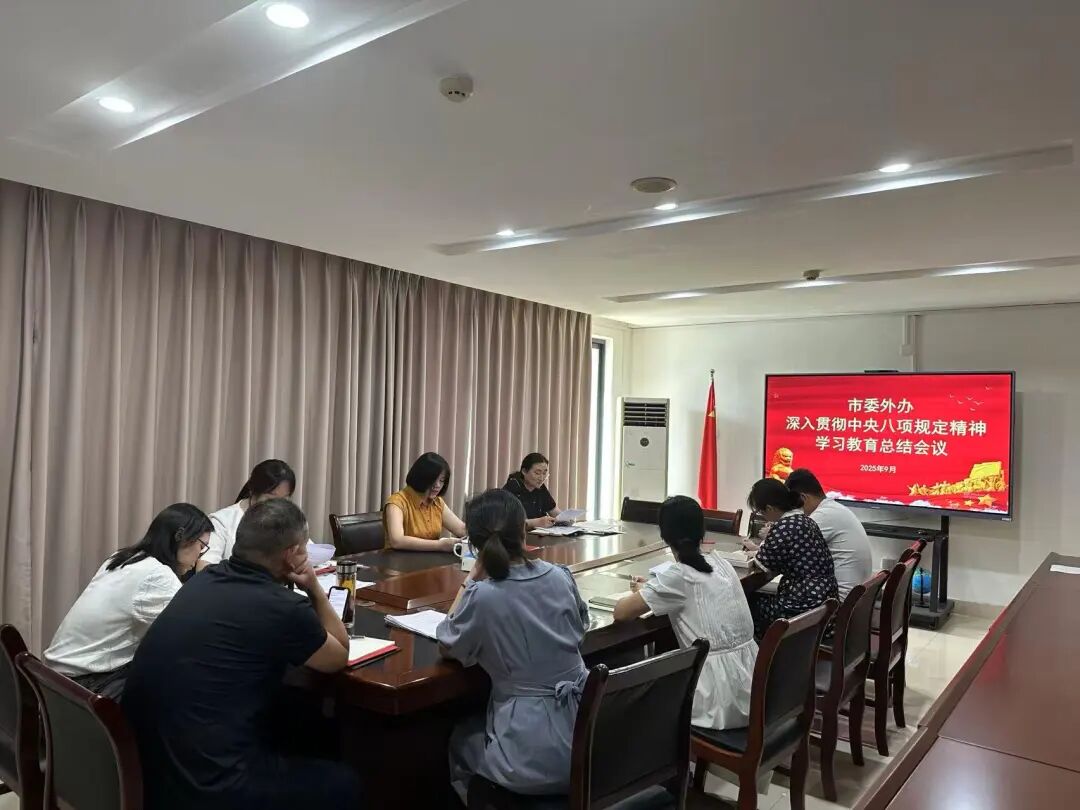 9月12日,市委外办主任张晓丹主持召开深入贯彻落实中央八项规定精神学习教育总结会议。会议传达学习了习近平总书记关于深入贯彻中央八项规定精神学习教育的重要指示和中央党的建设工作领导小组会议精神以及省委、市委有关会议精神,总结市委外办学习教育开展情况。